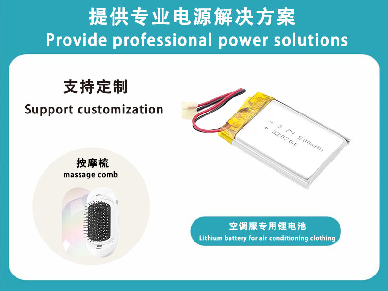 This electric massage comb uses a 3.7V 500mAh battery, the battery model is 602530, the vibration frequency is 6000 times/min, the charging time is 30-40 minutes, and the continuous use time is 20-30 minutes.